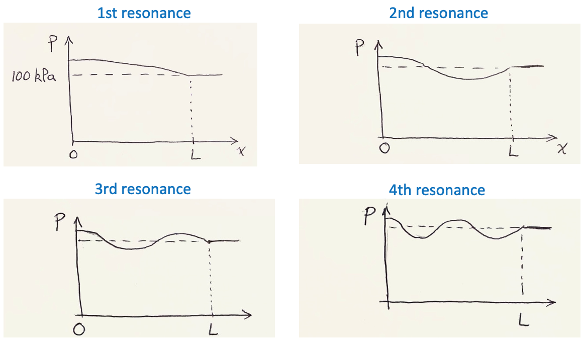 The graphs below show waves that have an anti-node a \(x=0\) and a node at \(x=L\). Outside bugle (\(x>L\)) the air pressure returns to normal. I have not shown the small ripple of sound leaving the bugle because pressure oscillations inside the bugle are much bigger than outside).