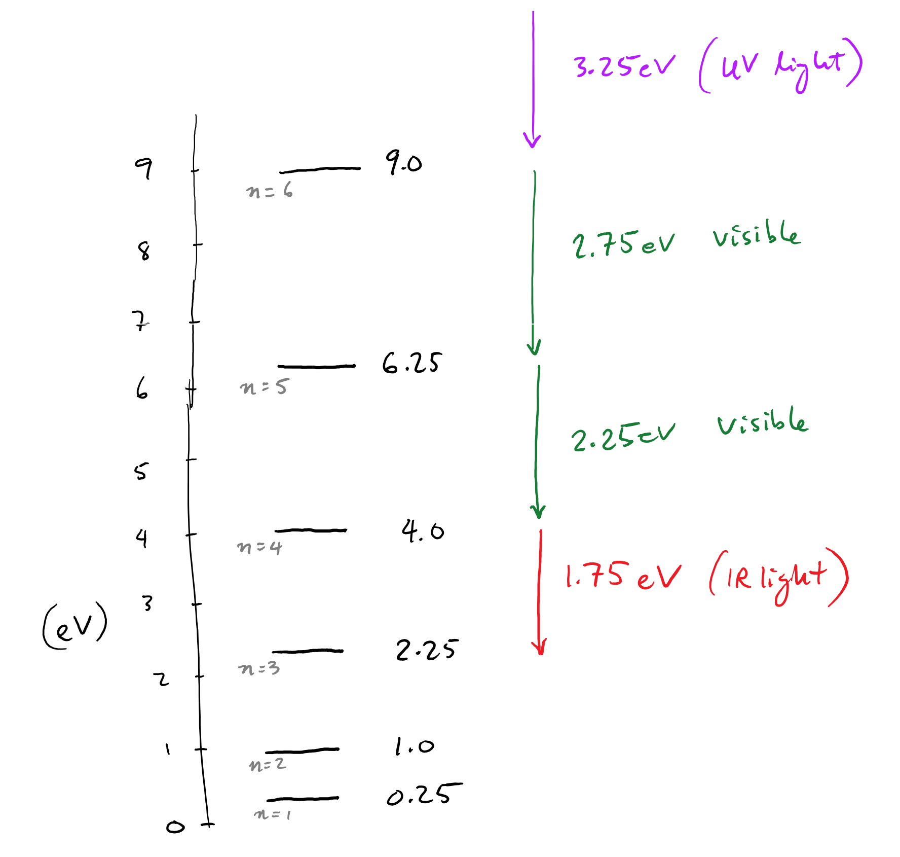 If \(\Delta n=5\) the system would emit photons of 3.75 eV or greater (outside the visible spectrum).![]()