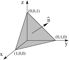 Take the cross product of any two vectors in the plane. For example, the vector \(-\mathbf{\boldsymbol{\hat x}}+\mathbf{\boldsymbol{\hat y}}\) that points from \((1,0,0)\) to \((0,1,0)\) and the vector \(-\mathbf{\boldsymbol{\hat x}}+\mathbf{\boldsymbol{\hat{z}}}\) that points from \((1,0,0)\) to \((0,0,1)\). The result is perpendicular to the plane. Make sure that the right hand rule gives the vector out of the plane in the direction that you want. Normalize the resulting vector to obtain: \[\mathbf{\boldsymbol{\hat n}} = \frac{1}{\sqrt{3}}\left(\mathbf{\boldsymbol{\hat x}} + \mathbf{\boldsymbol{\hat y}} + \mathbf{\boldsymbol{\hat{z}}}\right)\]