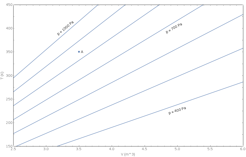 Translate the information on this diagram from the T-V plane to the p-V plane (i.e. draw contours of constant \(T\) on a graph of \(p\) vs \(V\)). Include point \(A\) on your p-V graph. Complete your graph by hand using discrete data points that you read from the T-V diagram. Make a fairly accurate sketch of the contours using the attached grid or in some other way making nice square axes with appropriate tick marks. Don't make up data for pressures above 1000 Pa or below 400 Pa.