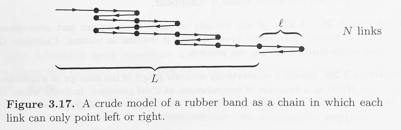 Polymers, like rubber, are made of very long molecules, usually tangled up in a configuration that has lots of entropy. As a very crude model of a rubber band, consider a chain of \(N\) links, each of length \(l\) (see Figure). \(N\) is very large. Imagine that each link has only two possible states, pointing either left or right. The total length of the rubber band is the net displacement from the begining of the first link to the end of the last link.