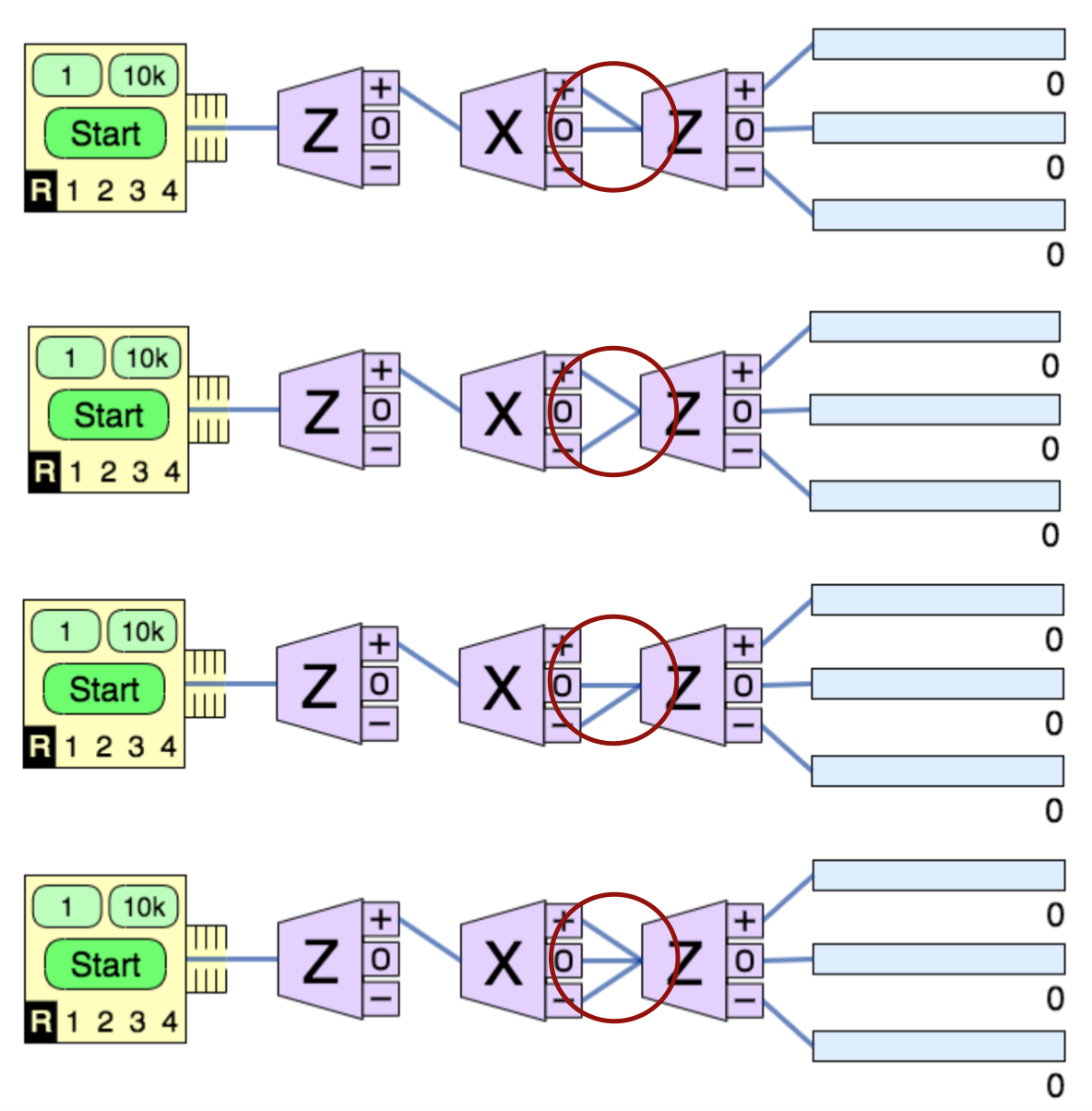 Consider a spin 1 interferometer which prepares the state as \(| 1\rangle\), then sends this state through an \(S_x\) apparatus and then an \(S_z\) apparatus. For the four possible cases where a pair of beams or all three beams from the \(S_x\) Stern-Gernach analyzer are used, calculate the probabilities that a particle entering the last Stern-Gerlach device will be measured to have each possible value of \(S_z\). Compare your theoretical calculations to results of the simulation. Make sure that you explicitly discuss your choice of projection operators.