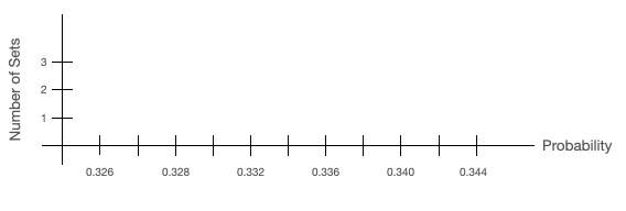 Plot a histogram of the probabilities you measured for each set. Use a bin size of 0.002 for the horizontal axis. (Choose appropriate values on the horizontal axis. You don't need to plot the full possible values 0-1. You may use a computer to make the histogram or you can sketch it by hand.)
